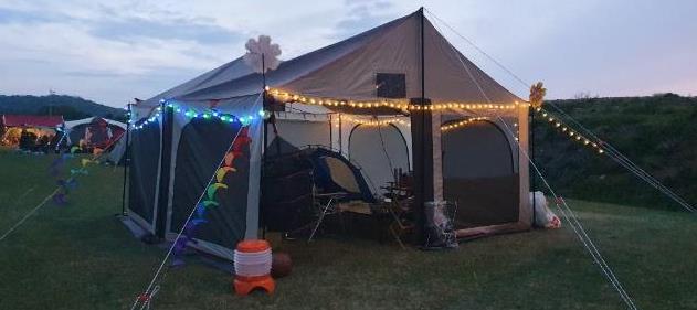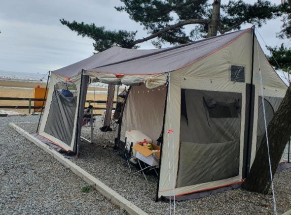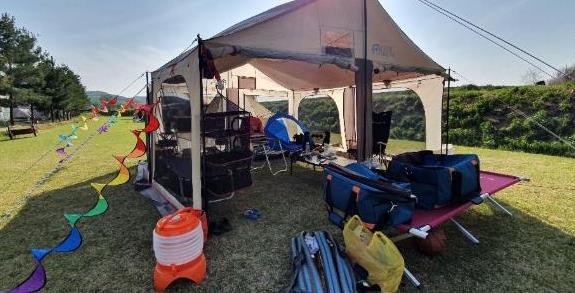 그리고 닫아 놓으면 저녁때는 전기장판이 없어도 그냥 캠핑용 침낭만 있어도 충분히 수면을 취할 수 있었네요. 새벽 때에는 물방울이 아주 약간 맺혔어요. 그렇지만 금방 말랐어요. 저희는 캠핑에는 아직 초보라 아는 지인 친구와 캠핑을 같이 다니고 있어요.