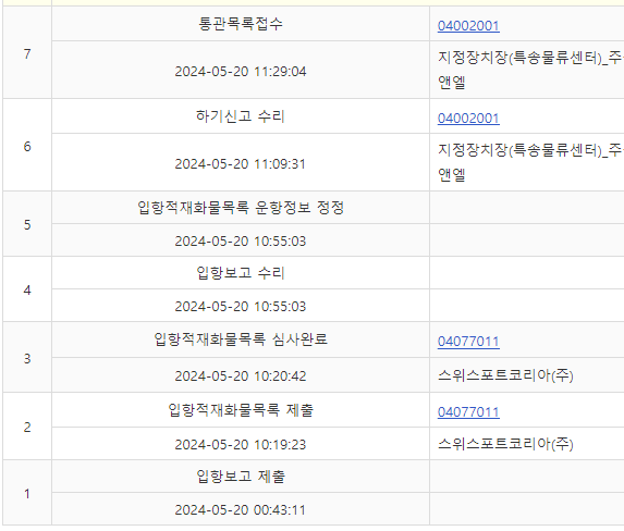 1~7단계(또는 1~6단계)까지는 서류제출단계로 통관대기중 상태입니다. 컨테이너가 반입되면 반입신고가 되고 본격적인 통관이 진행되는데 컨테이너 반입은 보통 1~3일정도 걸리지만 특송업체마다 기간이 차이가 있습니다.
