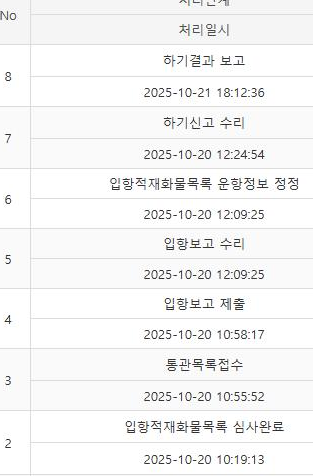 그럼 위와같이 나오는데요. 7단계 하기신고 수리란 공항에 컨테이너를 내렸다는 뜻이구요. 근데 컨테이너를 개봉해 보니 물건이 없어서 8단계 하기결과 보고라 나와있습니다.